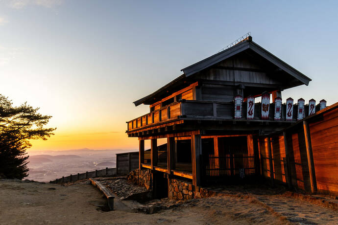 「鬼ノ城」は「桃太郎伝説」の鬼のモデルとなったと言われる「温羅」の居城ともいわれている山城跡。標高397メートルに位置し、晴れていれば、再現された西門の彼方に昇る日の出を見ることができます。ビジターセンターには乗用車約70台の駐車場がありますが、例年100名を超える訪問者が初日の出を待つため時間帯には注意しましょう。