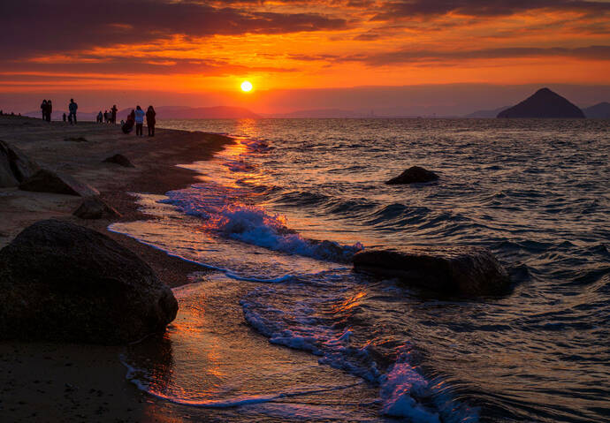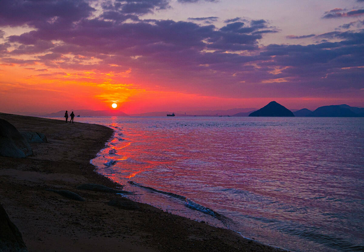 玉野市日の出海岸は、その名の通り日の出の絶景スポット。瀬戸内の島々の間から昇る瀬戸内ならではの多島美と日の出の取り合わせは絶妙です。遠くに瀬戸大橋も見える美しい海岸線は歩いても楽しいビュースポットです。