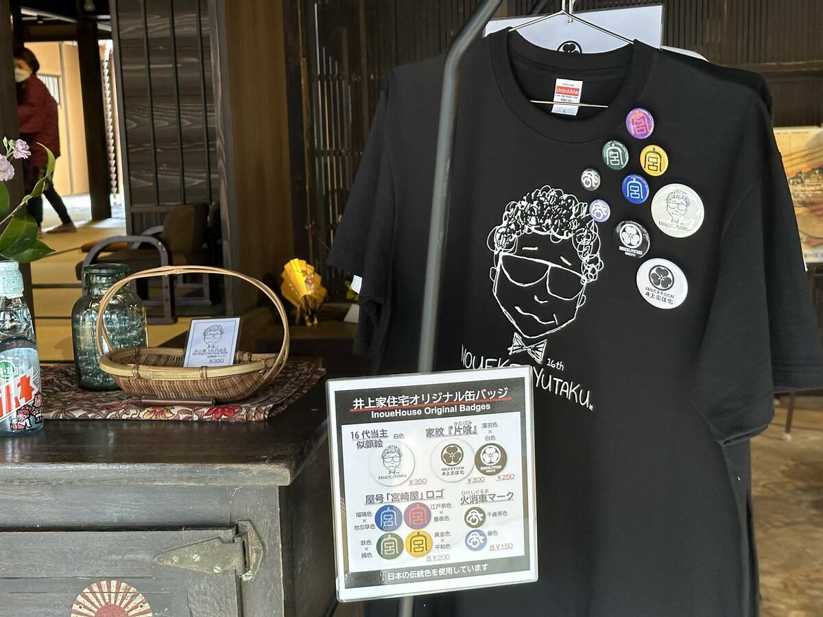 お土産コーナーでは当主の似顔絵、家紋、屋号「宮崎屋」をデザインした缶バッジやTシャツが販売されています。