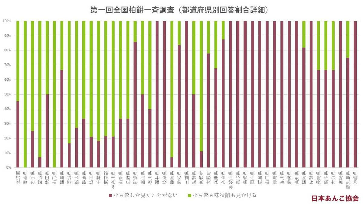 各都道府県において、「小豆あんしか見たことがない」と回答した人と「小豆あんも味噌あんも見かける」と回答した人の割合は以下のグラフの通りとなりました。なお、「味噌あんしか見たことがない」と回答した人はいませんでした。