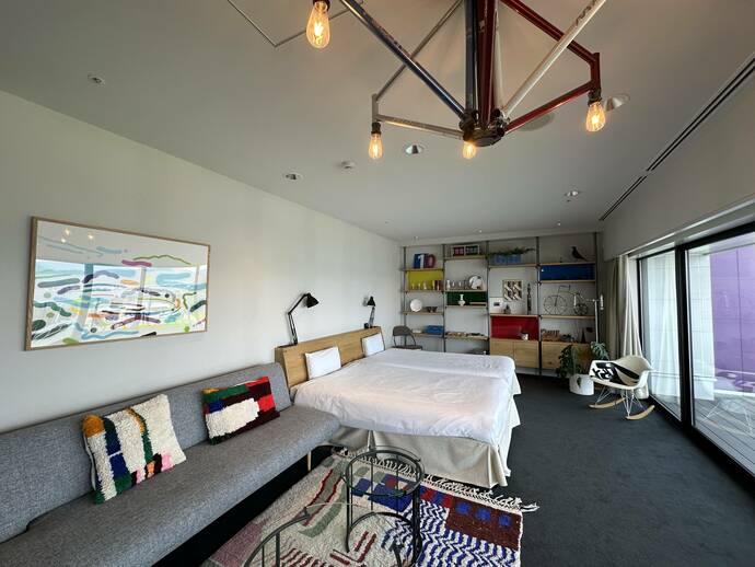 児島の老舗ジーンズメーカー「ベティスミス」とのコラボによって実現した客室も用意されています。まるでデニムに包まれているかのような、非日常的な空間です。デニムファンにとってはもちろん、そうでなくても新しい“アートとの出合い”になりそうです。