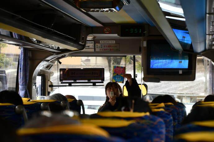 バスに乗り込むと、車内ではカモ井加工紙のプロモーション映像が流れ、スタッフさんがツアーの注意事項を丁寧に説明してくれます。移動時間は約20分。バスの中からもう“mtの世界”がスタートしていて、参加者は期待に胸を膨らませながら工場へ向かいました。
