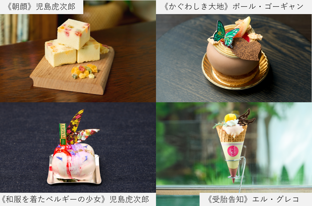 もうひとつのお楽しみは市内のスイーツ店10店舗で味わえる期間限定オリジナルスイーツ。大原美術館の名画をモチーフにしたケーキやデザートが並び、アート作品を“食べて味わう”特別な体験を楽しめます。見た目の美しさと味わいで、心もお腹も満たされること間違いなしです。