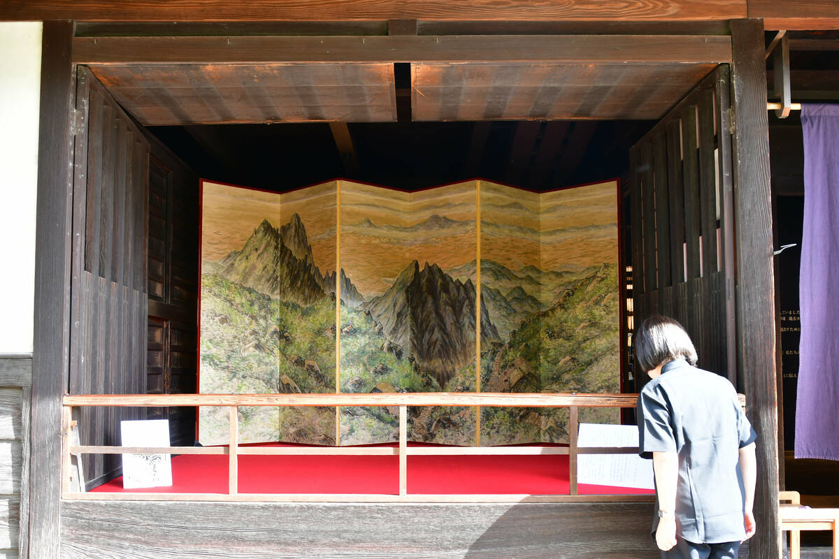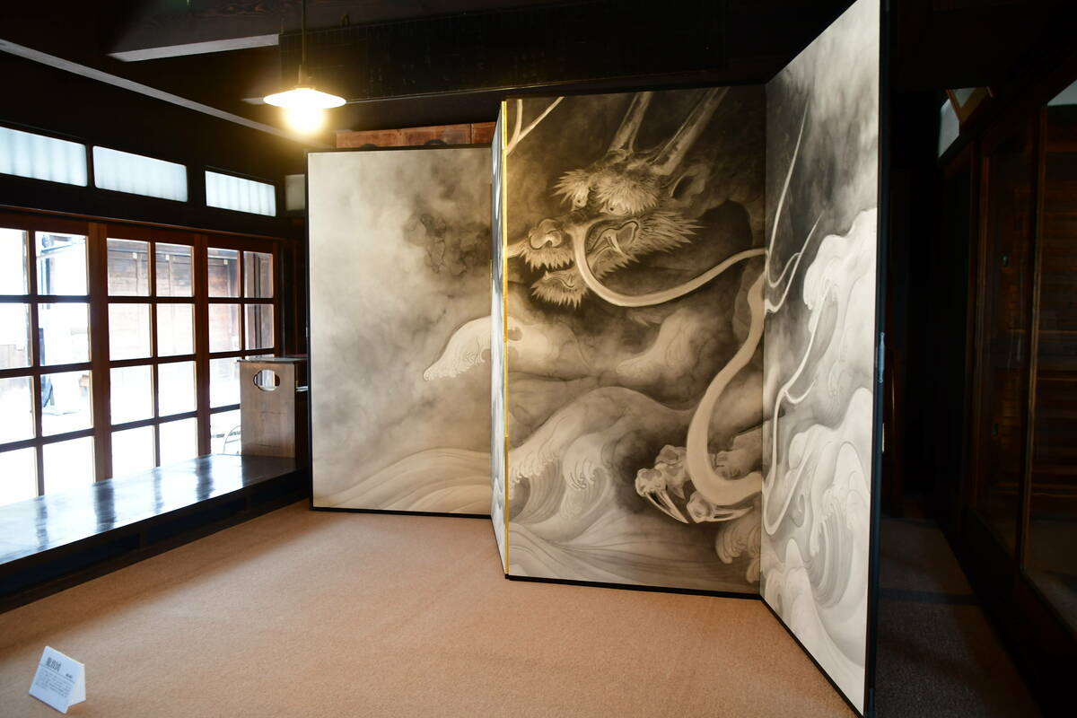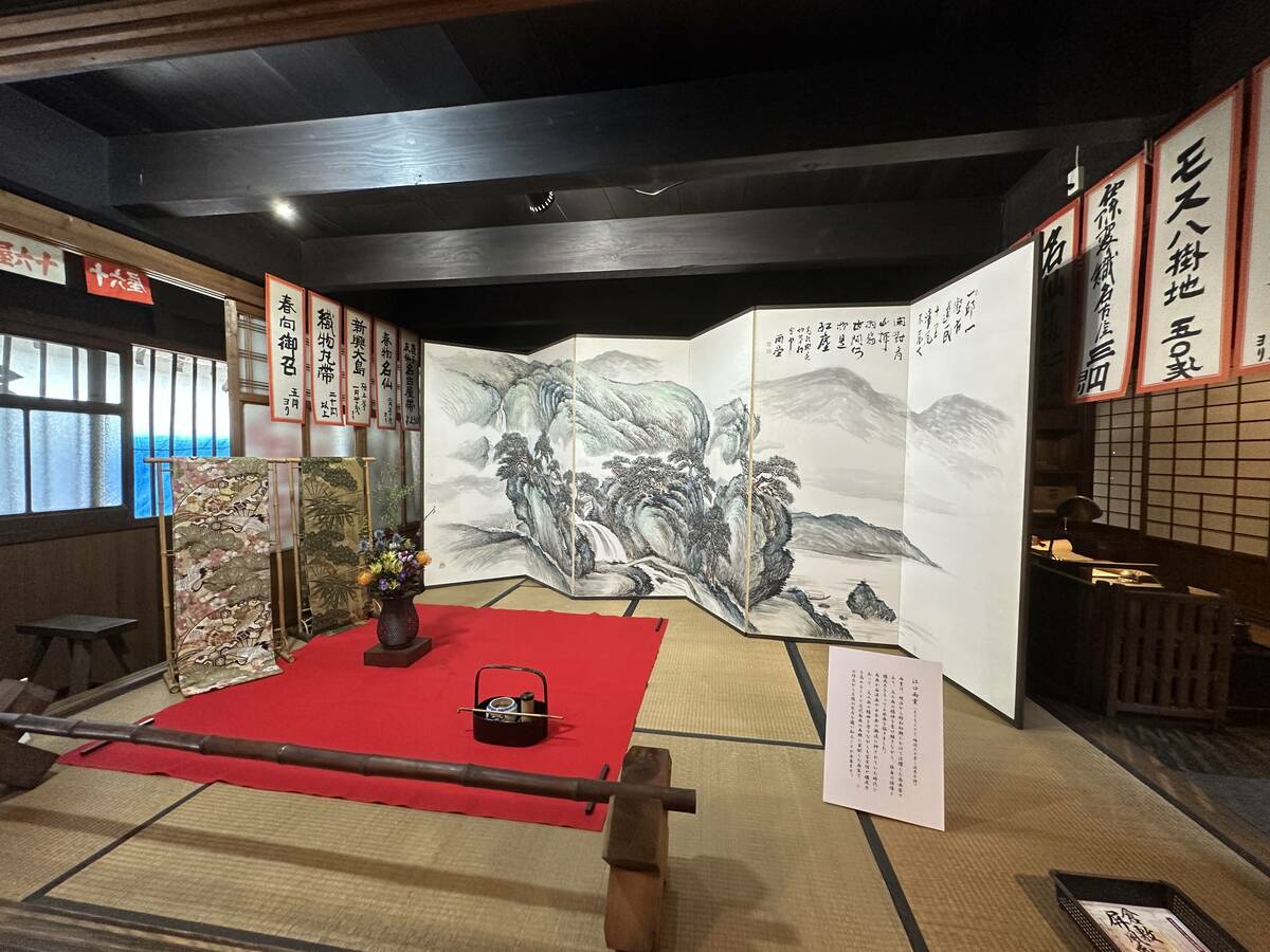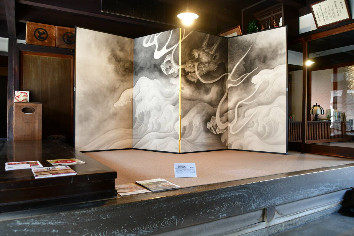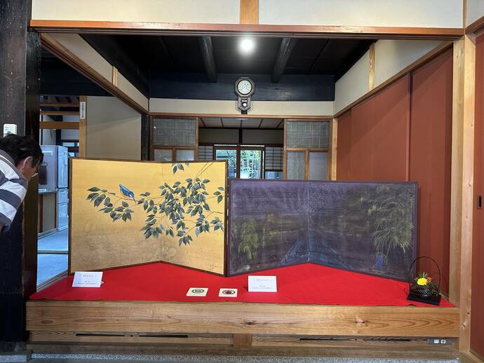 通りに面した町家の格子戸が開かれると、そこに現れるのは屏風のある町家の暮らしの原風景。外から眺めるだけでも美しいのですが、一歩足を踏み入れると、かつて商家として栄えた町家の立派な土間や座敷に、迫力満点の屏風が堂々と飾られていました。