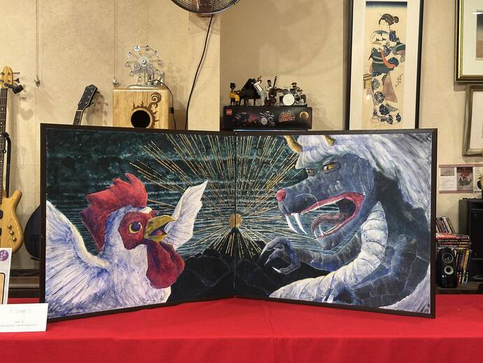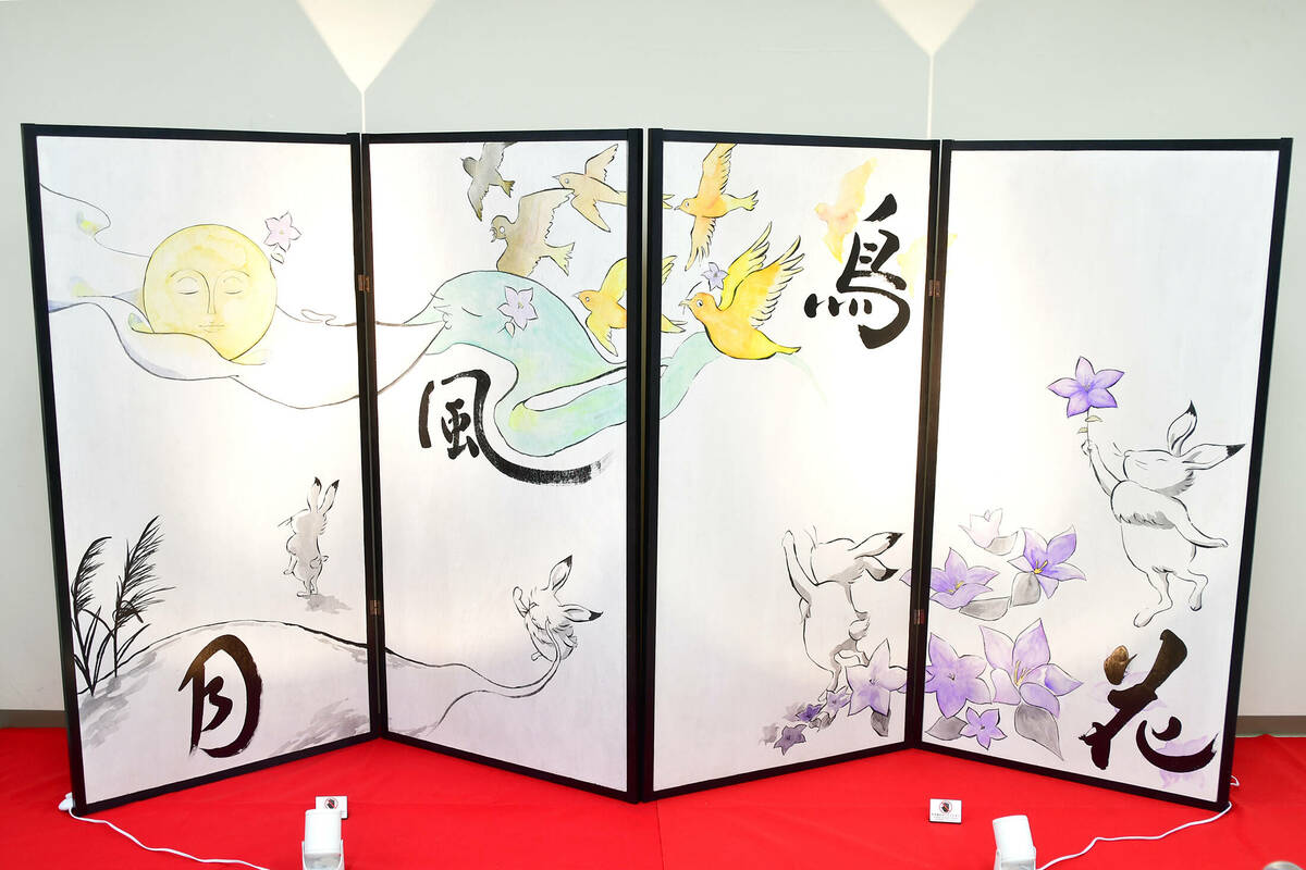 穏やかで静謐な白象の姿を描いた作品。大きな体に宿る精神的な安定と力強さが印象的。倉敷芸術科学大学による創作屏風は、伝統素材と現代感覚の融合がテーマです。阿智神社の能舞台に展示。
