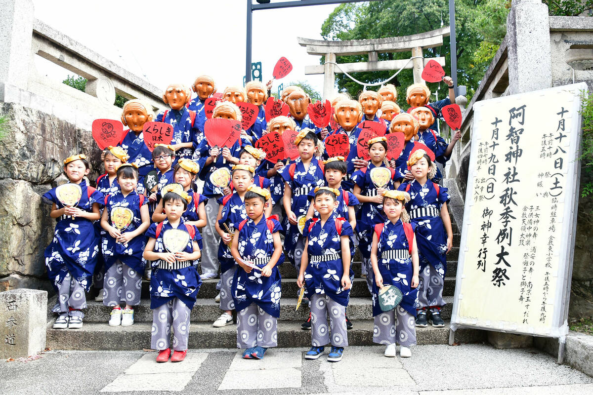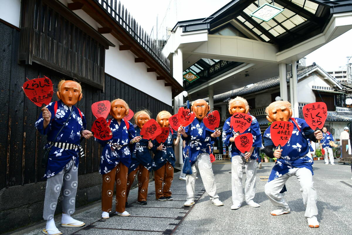 初日のお昼、美観地区には「素隠居(すいんきょ)」たちが集結。翁(おきな)と媼(おうな)の面をかぶった“大人素隠居”と、元気いっぱいの“子供素隠居”が勢揃いしました。