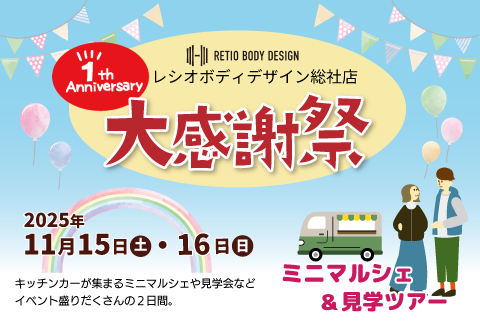 フィットネスジム「レシオボディデザイン総社店」で、11月15日(土)・16日(日)の2日間「大感謝祭」を開催します。人気のキッチンカーが集まるミニマルシェや施設見学ツアーなど、楽しい企画がいっぱいです。レシオボディデザインに通っている方も、まだ行ったことがない方も、気軽に立ち寄って、秋の週末を一緒に楽しみませんか。