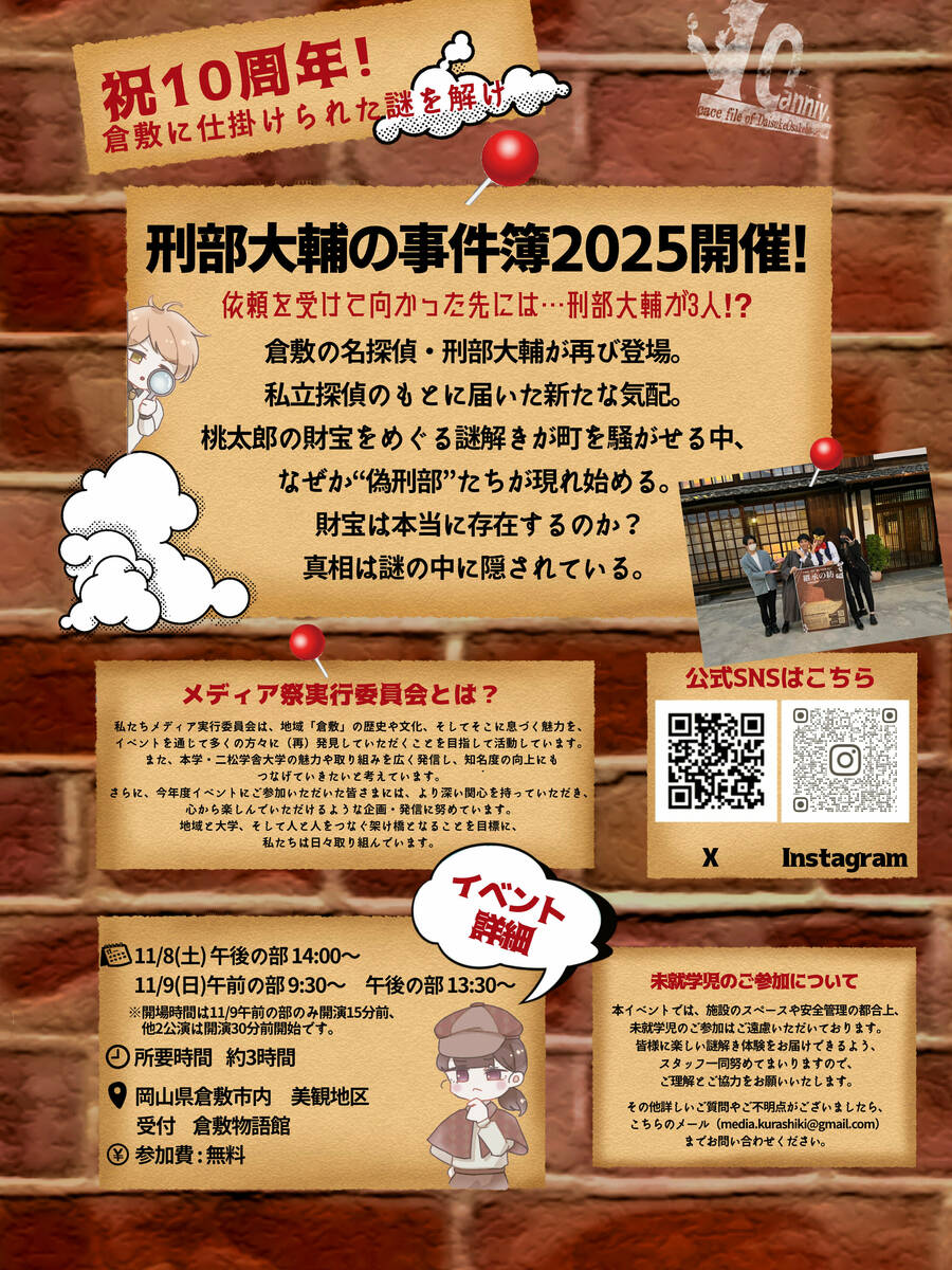 11月8日(土)・9日(日)には、学生が企画した体感型推理ゲーム「名探偵刑部大輔の事件簿」を開催。倉敷美観地区に隠された手がかりをもとに、事件の真相を解き明かす新感覚イベントです。参加無料・要事前申込。