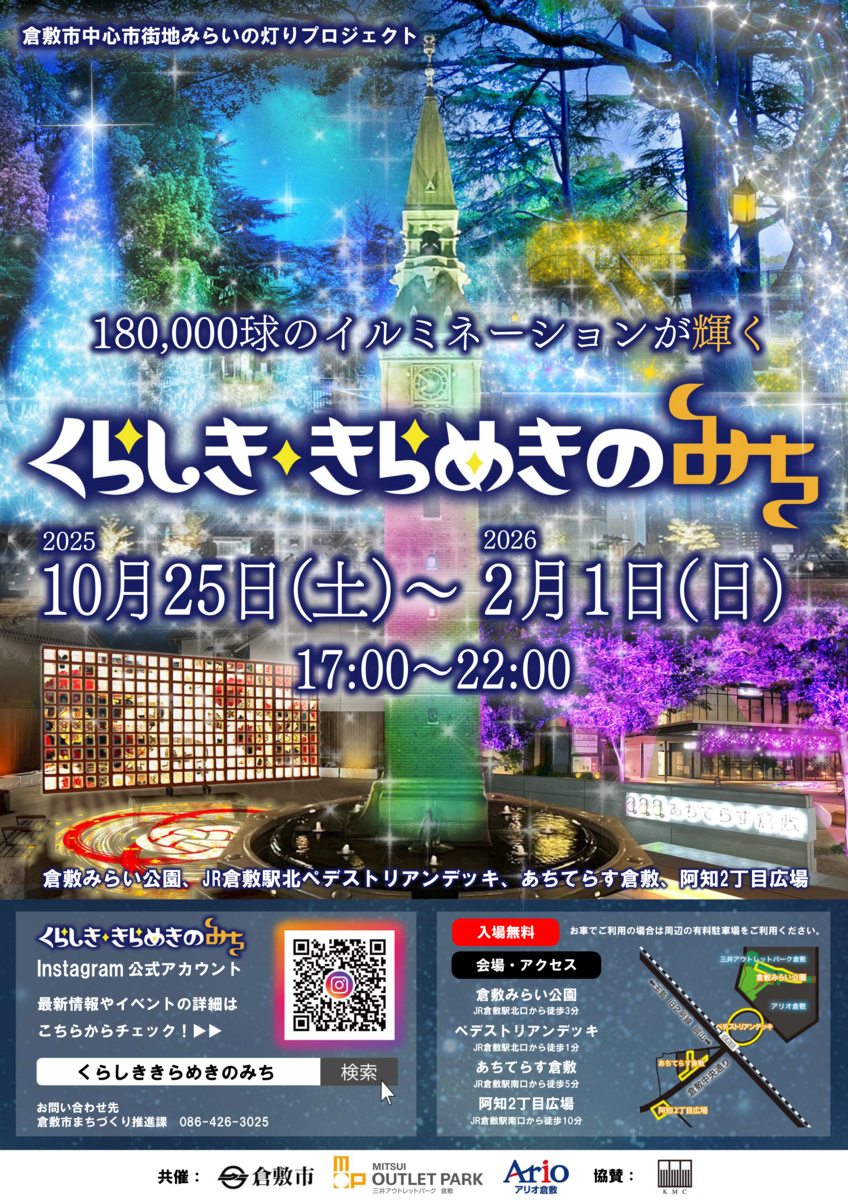 急速に冷え込んできましたね。冬の夜の散策がより楽しくなる季節がやってきます!倉敷の街をやさしい光で包む「くらしききらめきのみち2025」が、2025年10月25日(土)から2026年2月1日(日)まで開催。昨年より多い約18万球のLEDイルミネーションが、倉敷駅周辺を幻想的に彩ります。