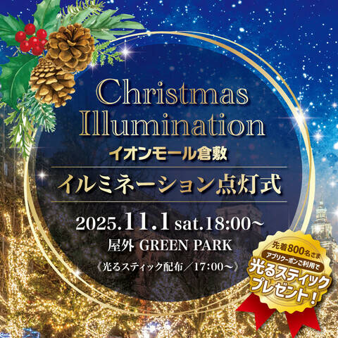 毎年恒例の華やかなイルミネーションが今年もイオンモール倉敷で始まります。2025年11月1日(土)、屋外GREEN PARKにて「クリスマスイルミネーション点灯式」が開催されます。プレゼントを配るブラックサンタの登場や、ダンスや吹奏楽のステージも開催。