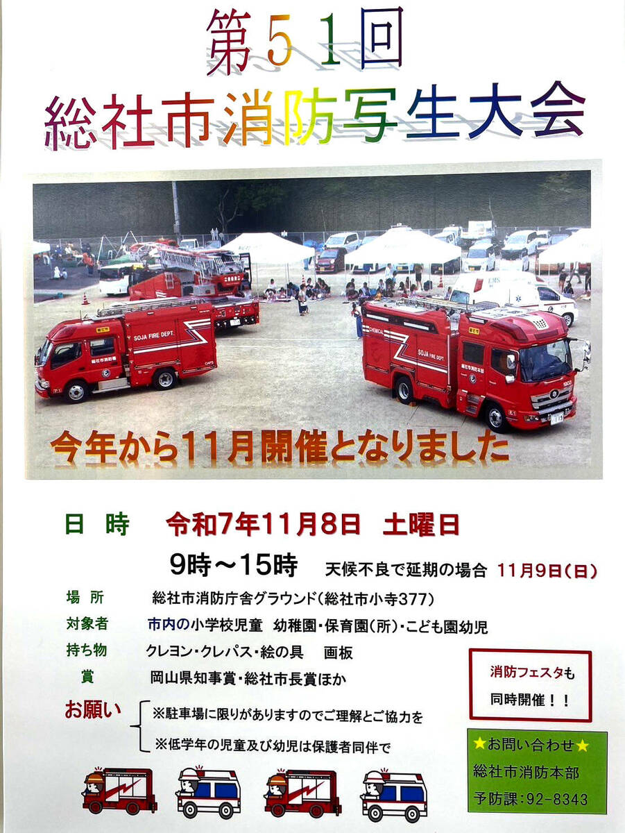 総社市では、第51回総社市消防写生大会を11月8日(土)に開催します。例年は9月に開催されてきた本イベントですが、熱中症対策のため今年から11月開催に。涼しい季節、青空の下でのびのび絵を描けるのがうれしいポイントです。