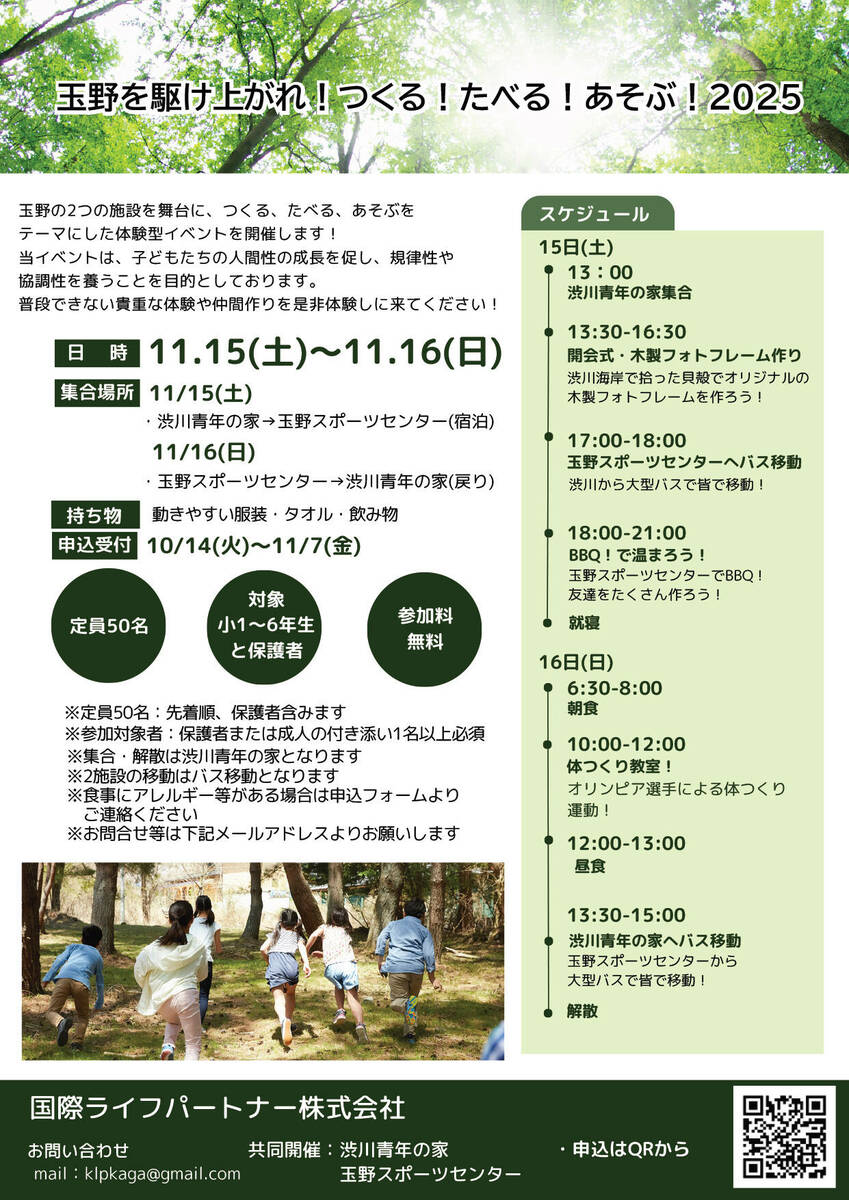 開催は11月15日(土)~11月16日(日)の2日間。申し込み期限は2025年11月7日(金)まで。定員は50名(保護者や成人の付き添い1名以上必須)です。お申し込みはお早めに。