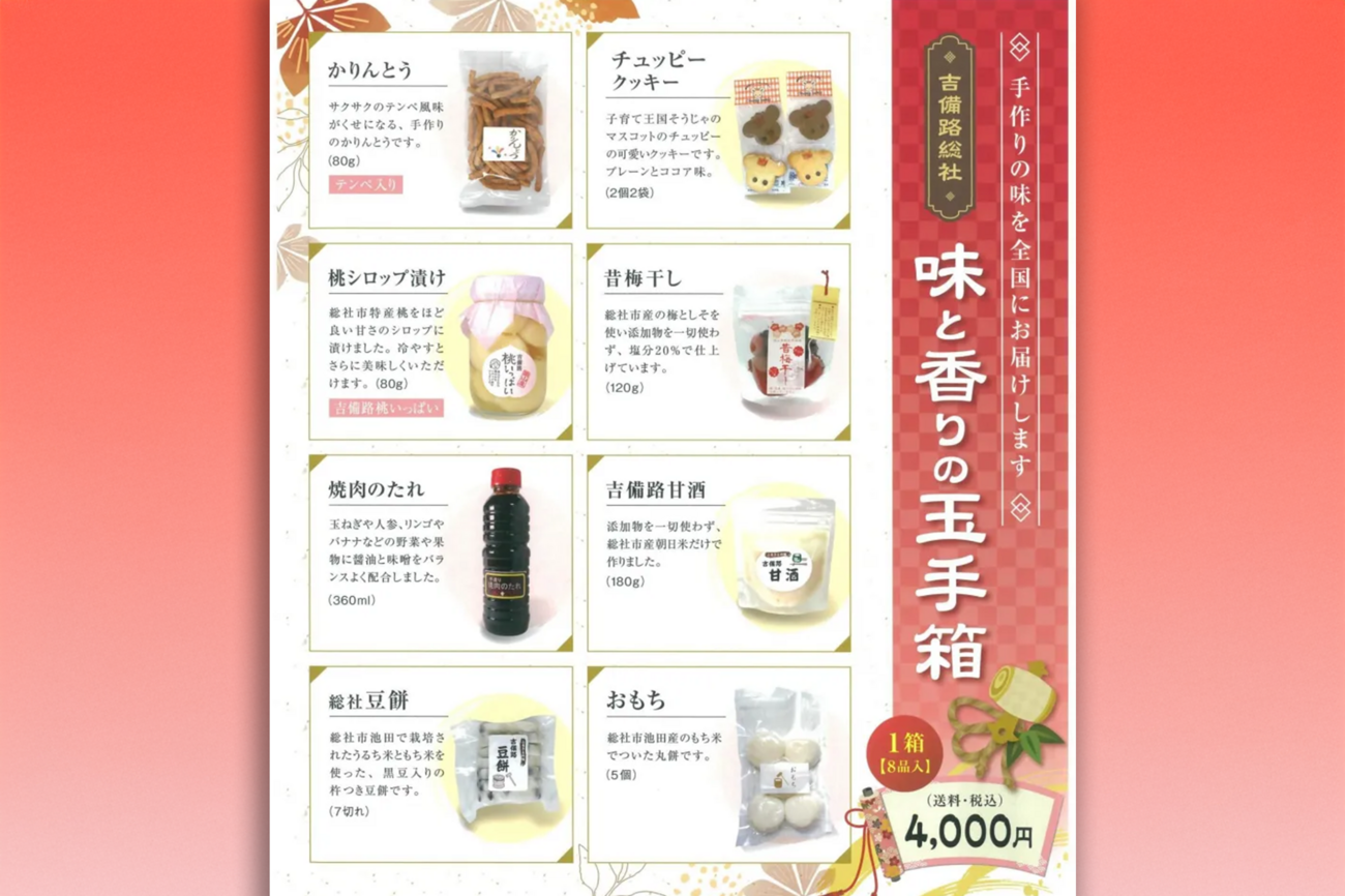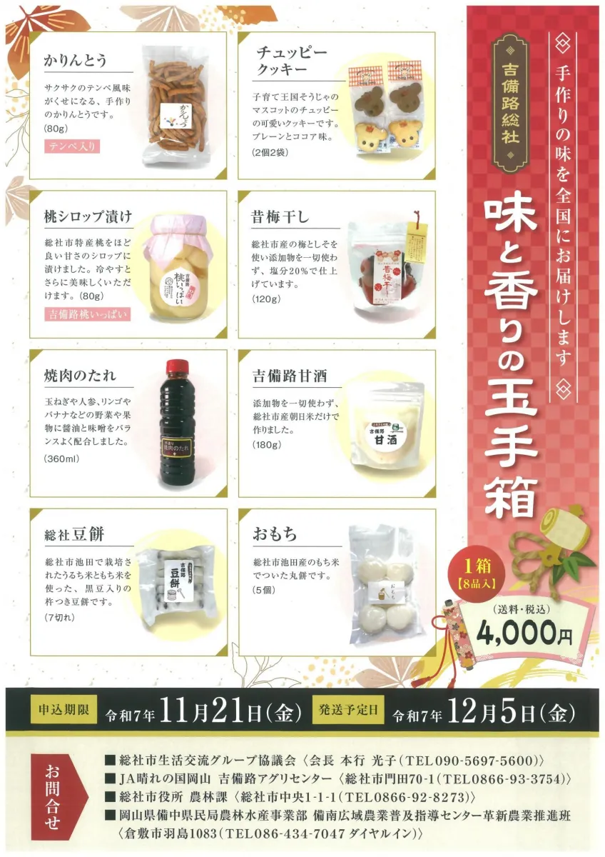 総社の美味しいものをぎゅっと詰めこんだ、冬限定の詰め合わせ「味と香りの玉手箱」が今年も登場します。総社市生活交流グループ協議会が、市内産の農産物を使用して手作りした加工品ばかり。懐かしいふるさとの味わいは、お歳暮にもご家庭用にもぴったりです。