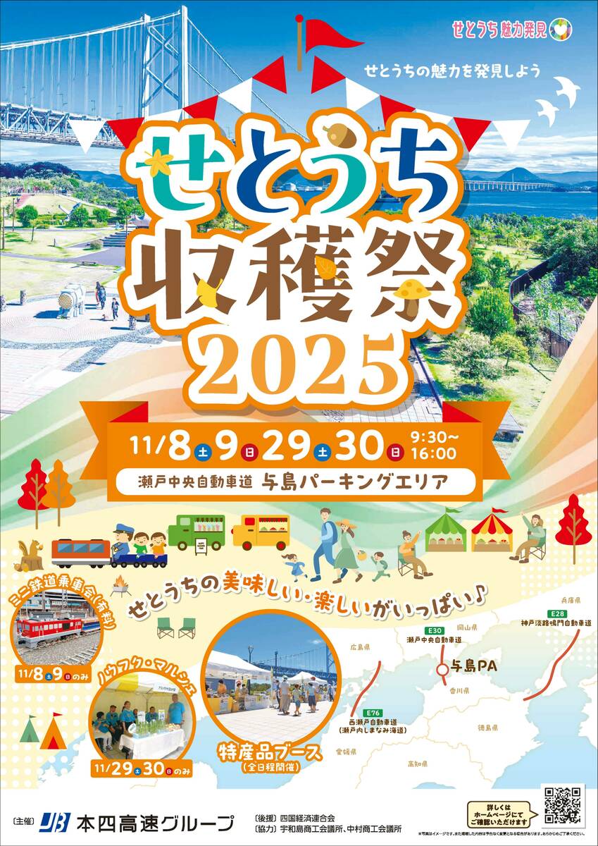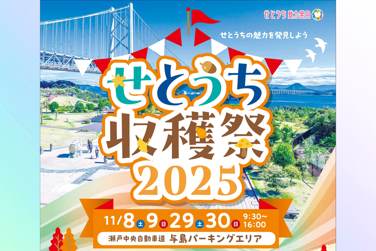 瀬戸内の特産品や楽しい体験がぎゅっと詰まった「せとうち収穫祭2025」が、与島PAで開催されます。JB本四高速グループが取り組む「せとうち魅力発見キャンペーン」の一環として行われるもので、家族で楽しめる秋のおでかけイベントです。会場は、瀬戸大橋の真ん中に位置する与島パーキングエリア。青い海に囲まれたロケーションの中で、瀬戸内の“おいしい”“たのしい”を満喫してみませんか?開催は11月8日(土)・9日(日)、11月29日(土)・30日(日)の4日間。