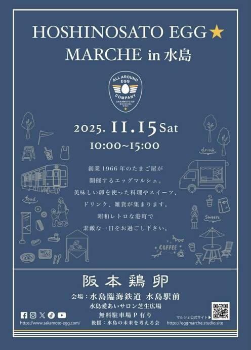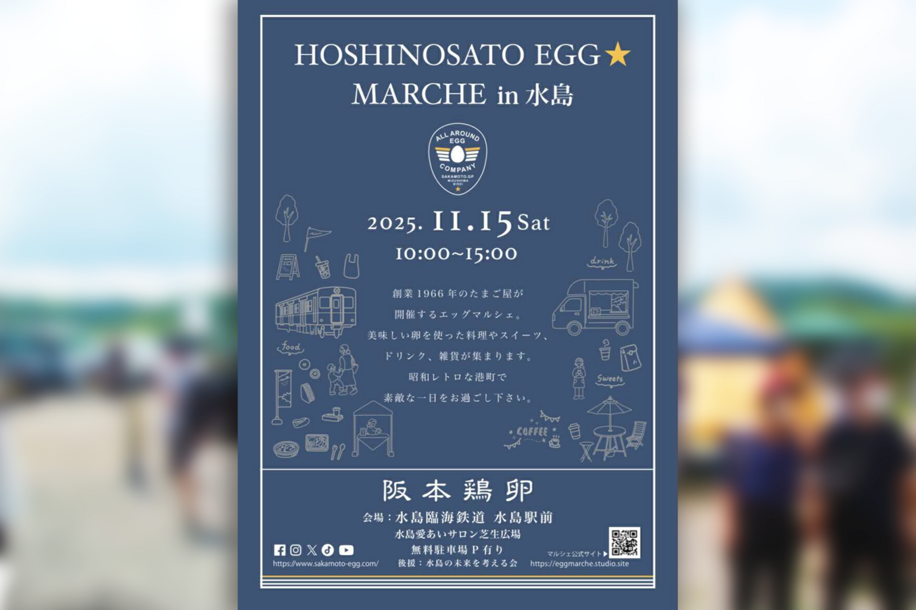 倉敷市水島で、卵の美味しさと地域の魅力を楽しめるイベント「HOSHINOSATO EGG★MARCHE in 水島」が開催されます。会場は水島臨海鉄道・水島駅前の水島愛あいサロン芝生広場。昭和レトロな港町の空気とともに、料理・スイーツ・雑貨が並ぶ水島ならではのマルシェです。