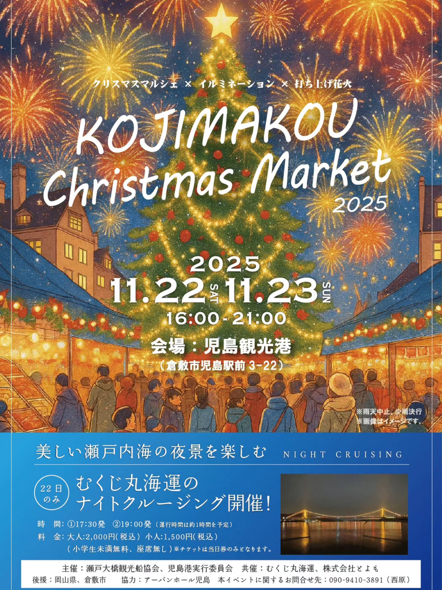 KOJIMAKOU Christmas Market 2025 開催!冬の児島港がイルミと花火で輝く2日間【11月22日・23日】