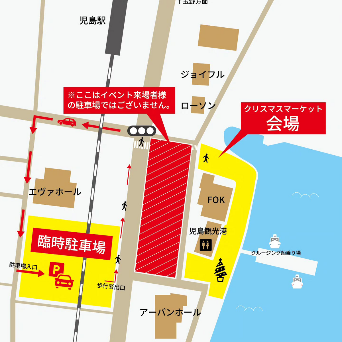 会場はJR児島駅から徒歩約5分とアクセス良好。無料の臨時駐車場が設けられています。瀬戸大橋観光船協会やFOKの駐車場は利用できませんのでご注意を。混雑が予想されるため、公共交通機関の利用をおすすめします。