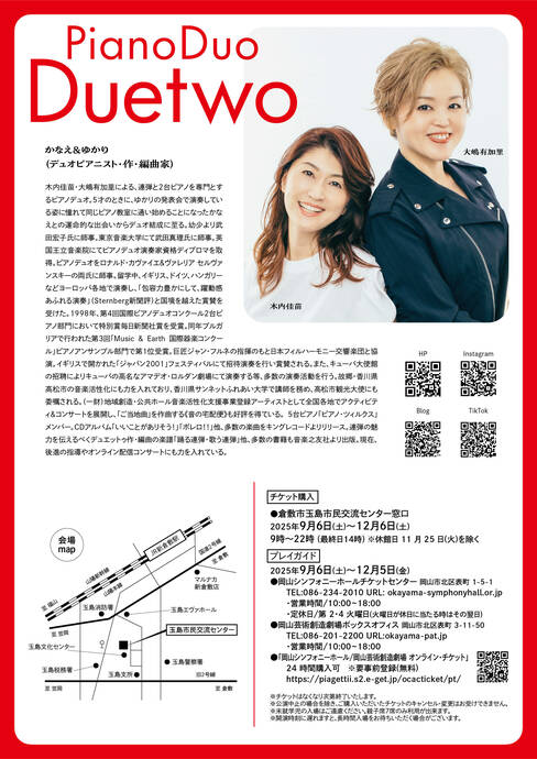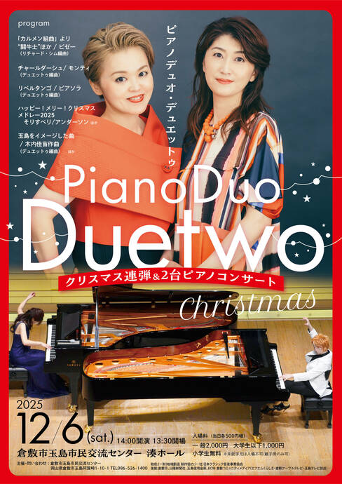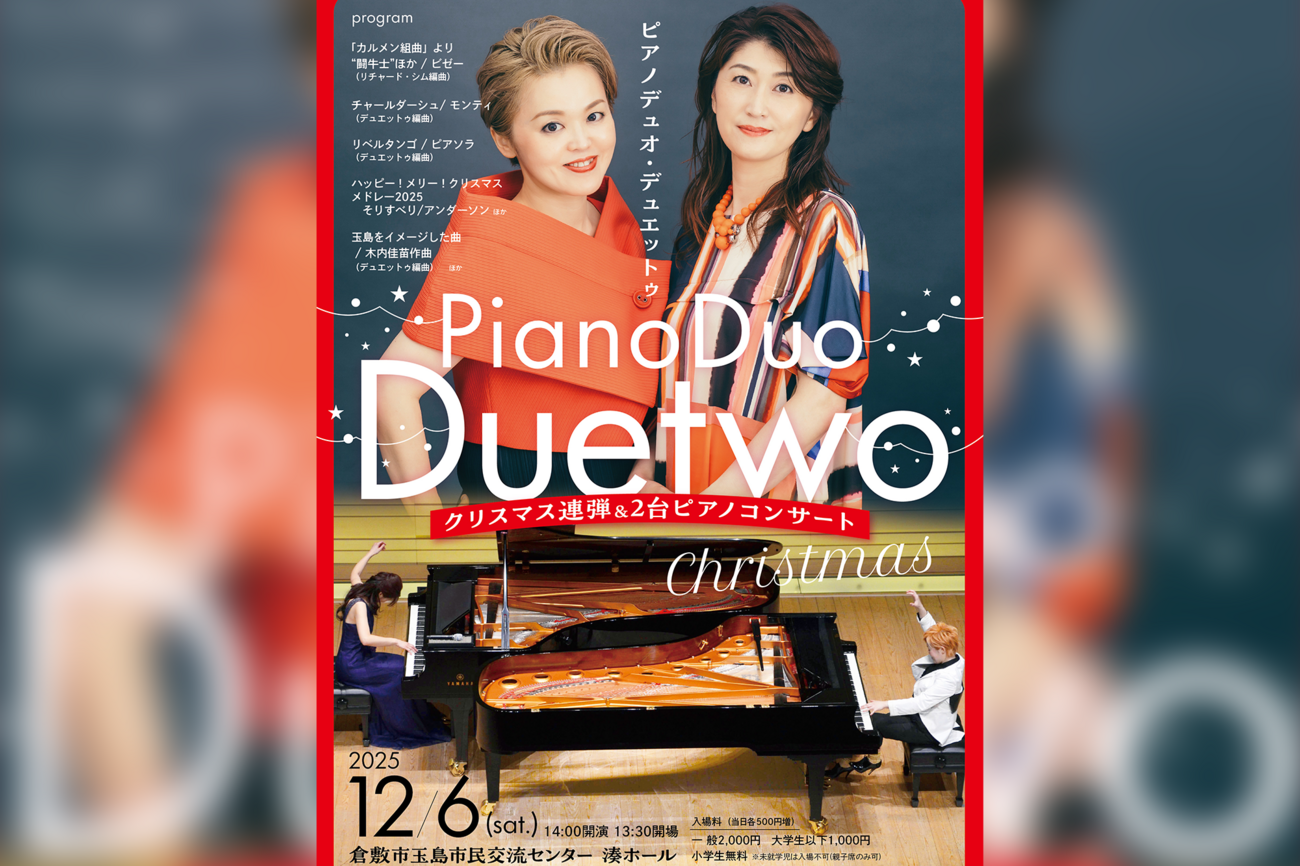 玉島市民交流センターで12月6日(土)にピアノデュオ・デュエットゥ クリスマス連弾&2台ピアノコンサートが開催されます。