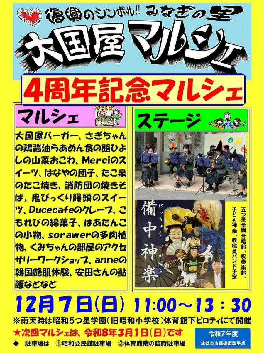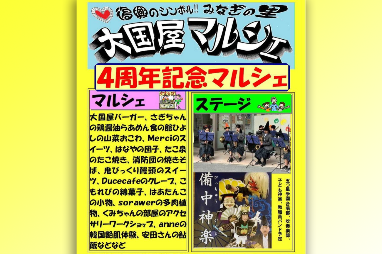 総社市美袋駅前の交流拠点「みなぎの里 大国屋」が、今年で4周年を迎えます。これを記念して、地域の飲食店や雑貨店が集まる特別なマルシェが開催されます。大国屋は、西日本豪雨の仮設住宅をリノベーションして生まれた昭和地区の復興シンボル。4年間の歩みを支えてきた地域の人々への感謝をこめて、にぎやかな記念イベントが12月7日に開催です。