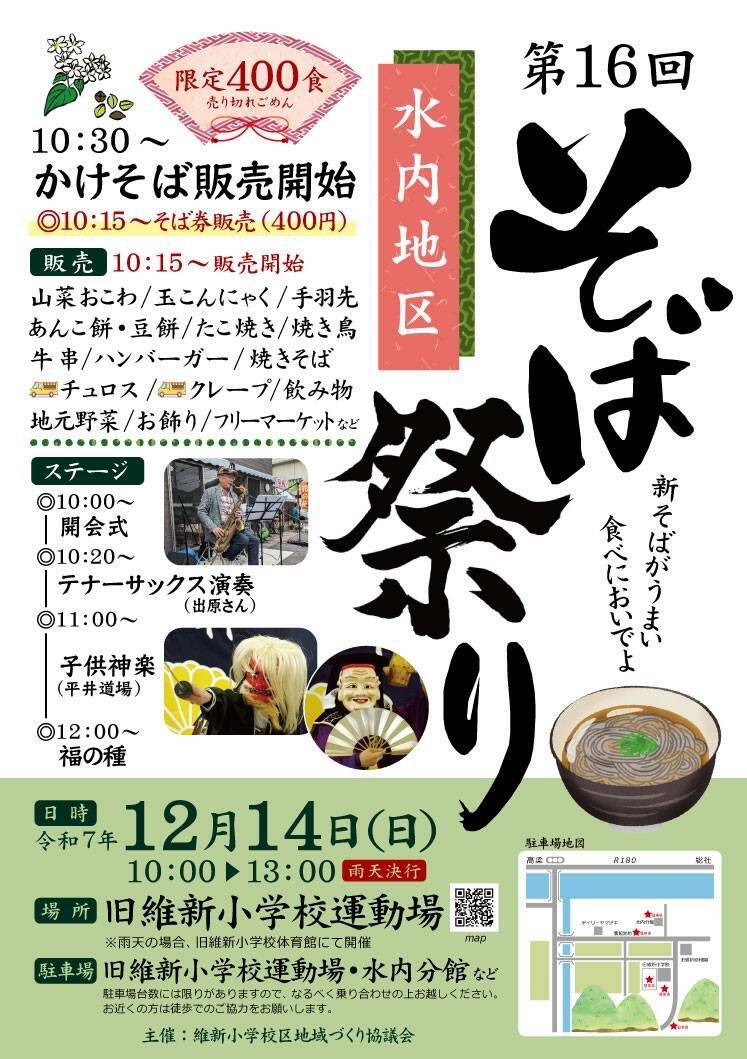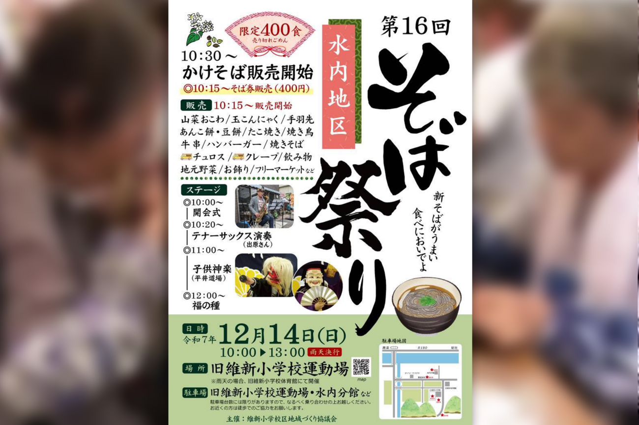 総社市水内地区の冬の恒例行事「そば祭り」が、12月14日(日)に旧維新小学校運動場で開催されます。第16回となる今回は、香り豊かな新そばを味わえるほか、地元グルメや手づくり雑貨、子供神楽など、地域の魅力がぎゅっと詰まった内容です。家族でのんびり過ごすにも、地元のおいしい物を楽しみたい方にもぴったりのイベントです。