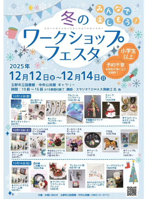 玉野市立図書館・中央公民館で「冬のワークショップフェスタ」が開催されます。冬休みに家族で楽しめる手作り体験イベントで、2025年12月12日(金)〜14日(日)の3日間、各日10時〜16時(15時受付終了)に開催されます。