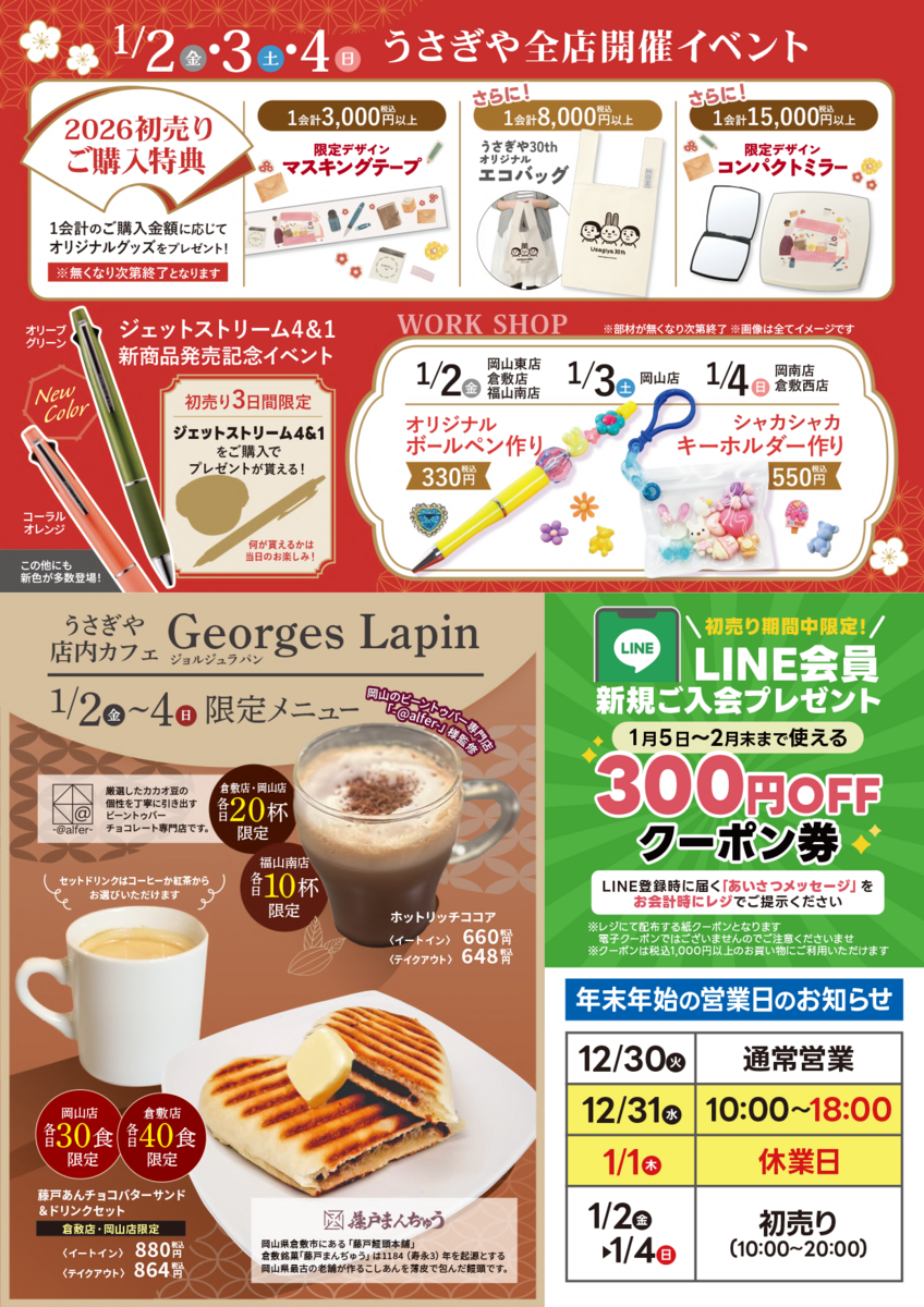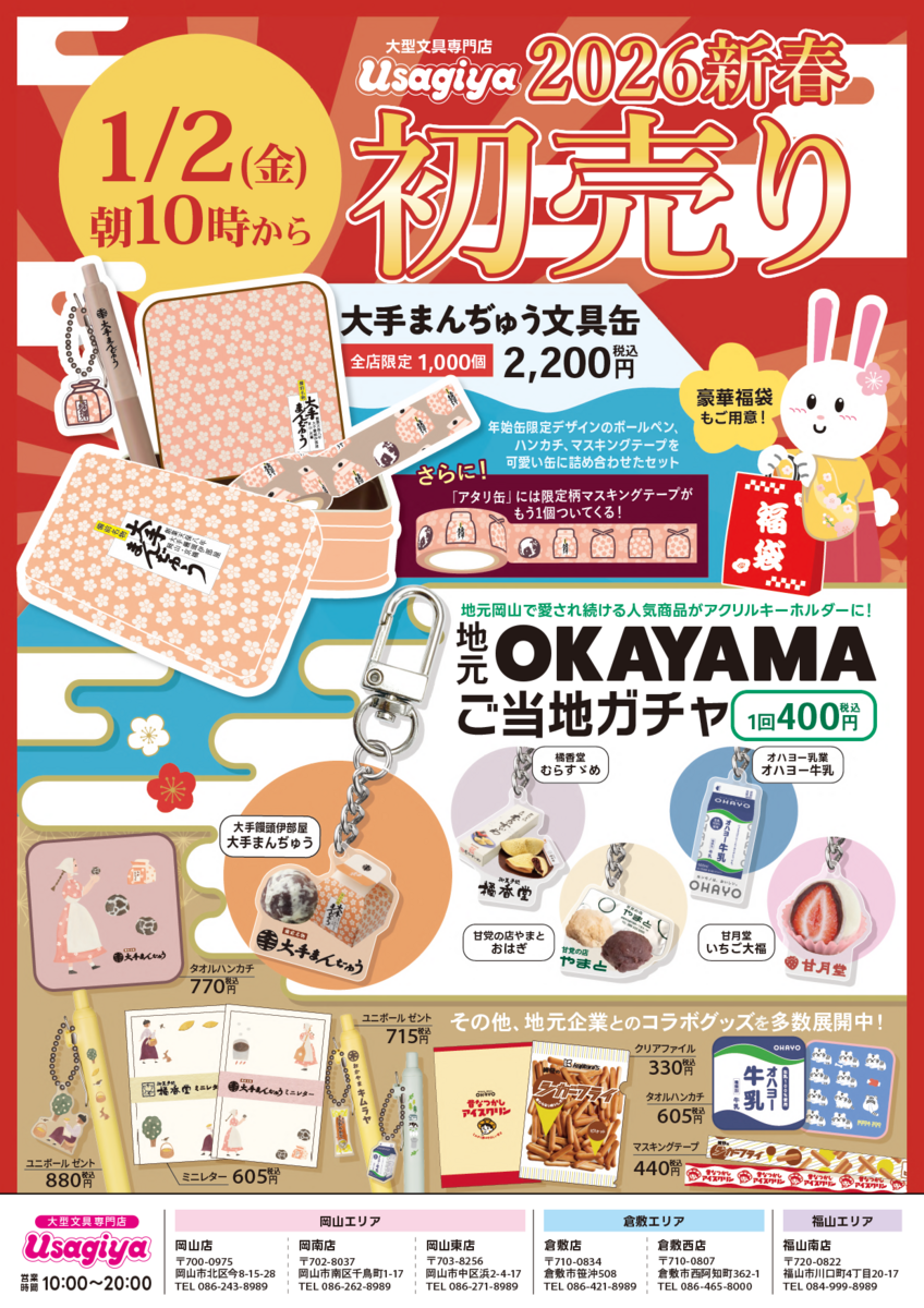 文具専門店「うさぎや」では、2026年1月2日(金)朝10時から、新春初売りを開催します。岡山・倉敷・福山エリアの各店舗で行われ、限定商品やご当地企画、購入特典、ワークショップなど、お正月ならではの企画がもりだくさん。