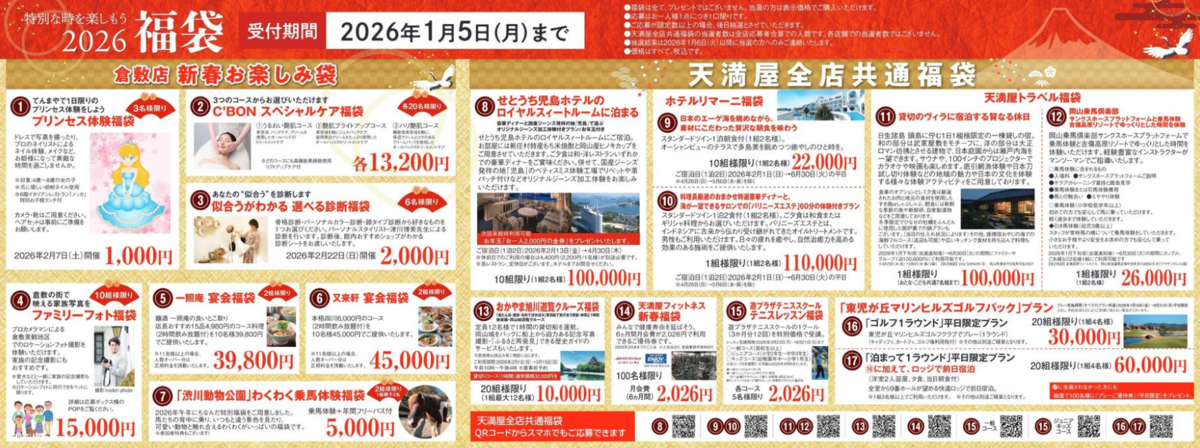 体験型が主役!天満屋「HAPPY福袋 2026」受付中&初売り 倉敷店限定企画や瀬戸内宿泊プランも