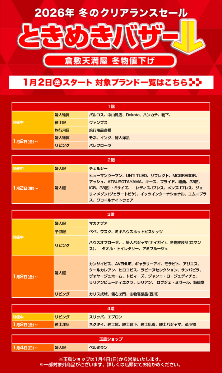 倉敷天満屋では、2026年1月2日(金)から冬物クリアランスセール「ときめきバザール」がスタートします。館内各フロアで、婦人服・紳士服・子ども服から雑貨、リビング用品まで、幅広いジャンルの冬物商品が値下げ対象となる、毎年恒例のセールです 。