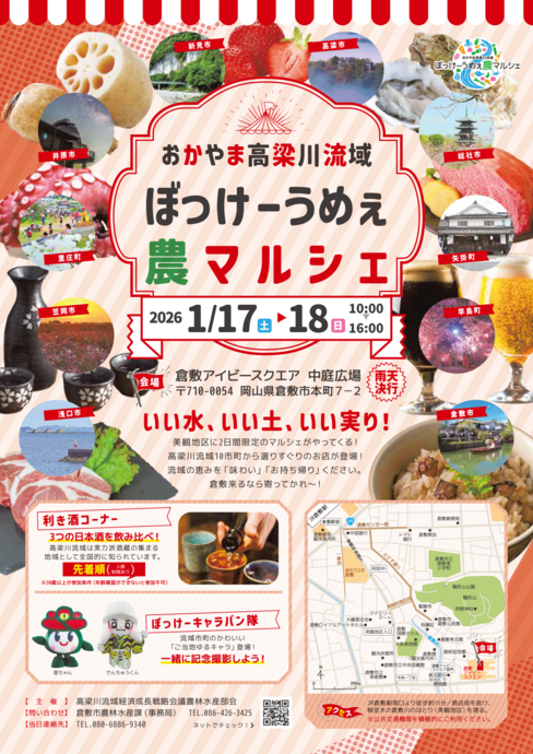 高梁川流域の豊かな恵みを一堂に集めたイベント「おかやま高梁川流域 ぼっけーうめぇ農マルシェ」が、2026年1月17日(土)・18日(日)の2日間、倉敷アイビースクエア中庭広場で開催されます。