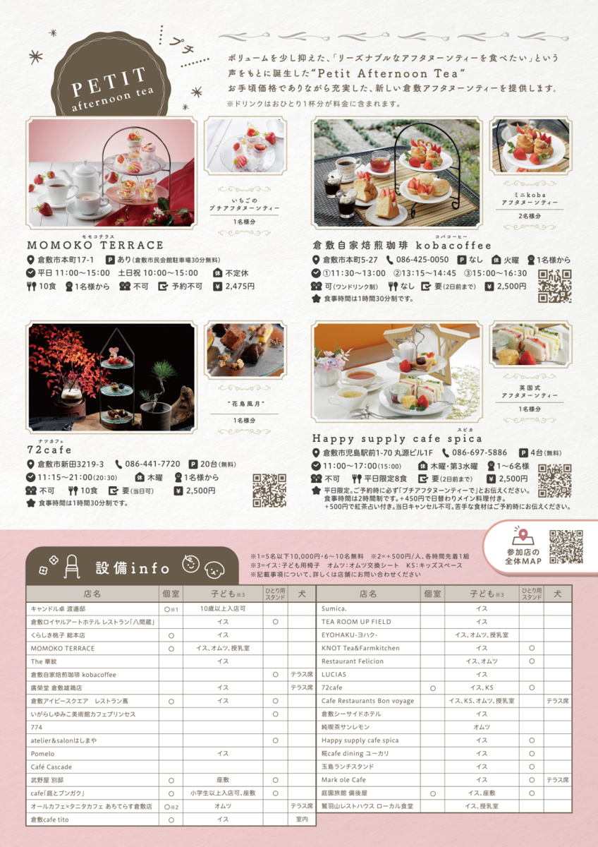 倉敷美観地区周辺では、町並みと調和した和洋折衷のアフタヌーンティーを提供する店舗が多く、散策とあわせて楽しむのもおすすめです。児島エリアには、瀬戸内海を望む立地を生かした店舗もあり、ドライブがてらに立ち寄るのもおすすめ。玉島・水島方面では、駐車場を備えた店舗も見られ、車での来店がしやすい点も魅力です。