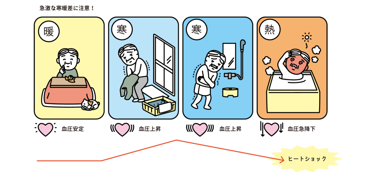 室内を暖かく保ち、断熱効果を高める工夫をすること、トイレや廊下、玄関など寒くなりやすい場所も意識して暖めること。入浴時だけでなく、住まい全体の環境づくりも大切です。