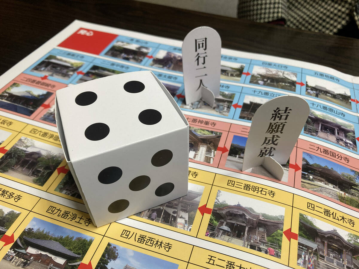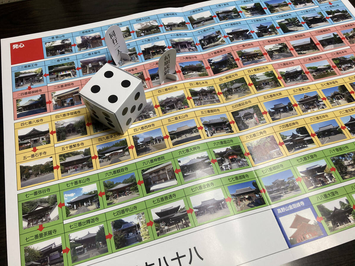 すごろくマップには1番札所の霊山寺から八十八番札所の大窪寺までが順に描かれており、さいころの目に従って駒を進めます。すごろくを楽しみながら、足踏みをするなど体力に応じてそれぞれに「疑似お遍路」を体験できます。