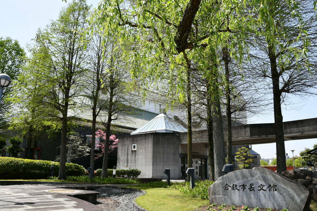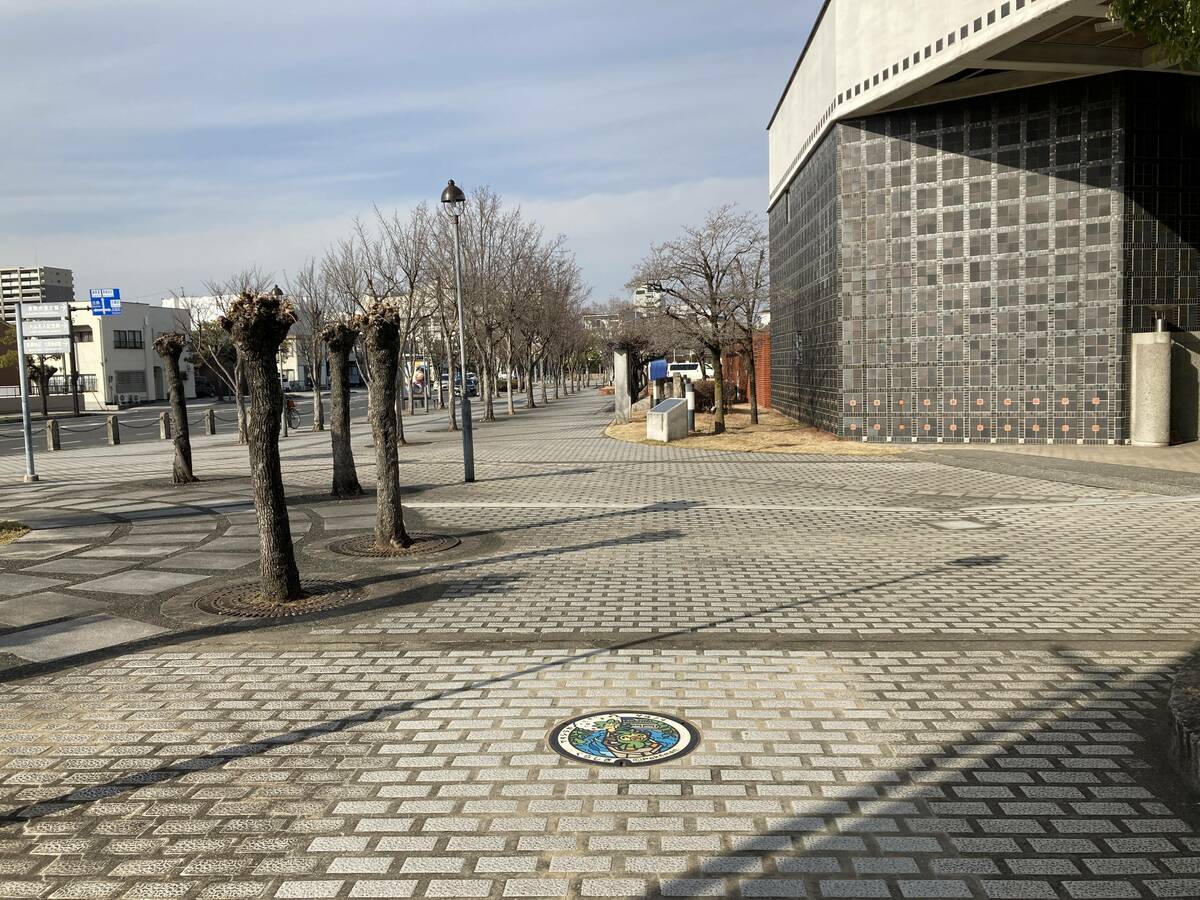 続いては、自然史博物館からほど近い「倉敷市芸文館」へ。 こちらの広場には、「サルノリ」と「ワタシラガ」が描かれたポケふたがあります。美観地区の川舟流しをイメージさせるデザインが特徴です。緑豊かな広場で、テイクアウトグルメを片手に少し休憩するのもおすすめです。