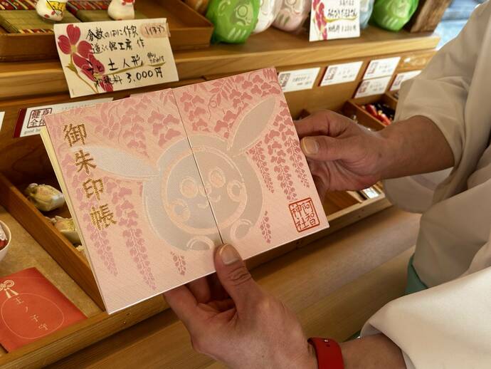 ポケふたを見つけたら、長い階段を上って境内へ。随身門には、最近「うさぎの神社」として話題のうさぎの彫刻があります。境内からは美観地区の町並みを一望でき、オリジナルのおみくじ「いろはうら」や、「阿知の藤」をモチーフにした御朱印帳なども人気です。