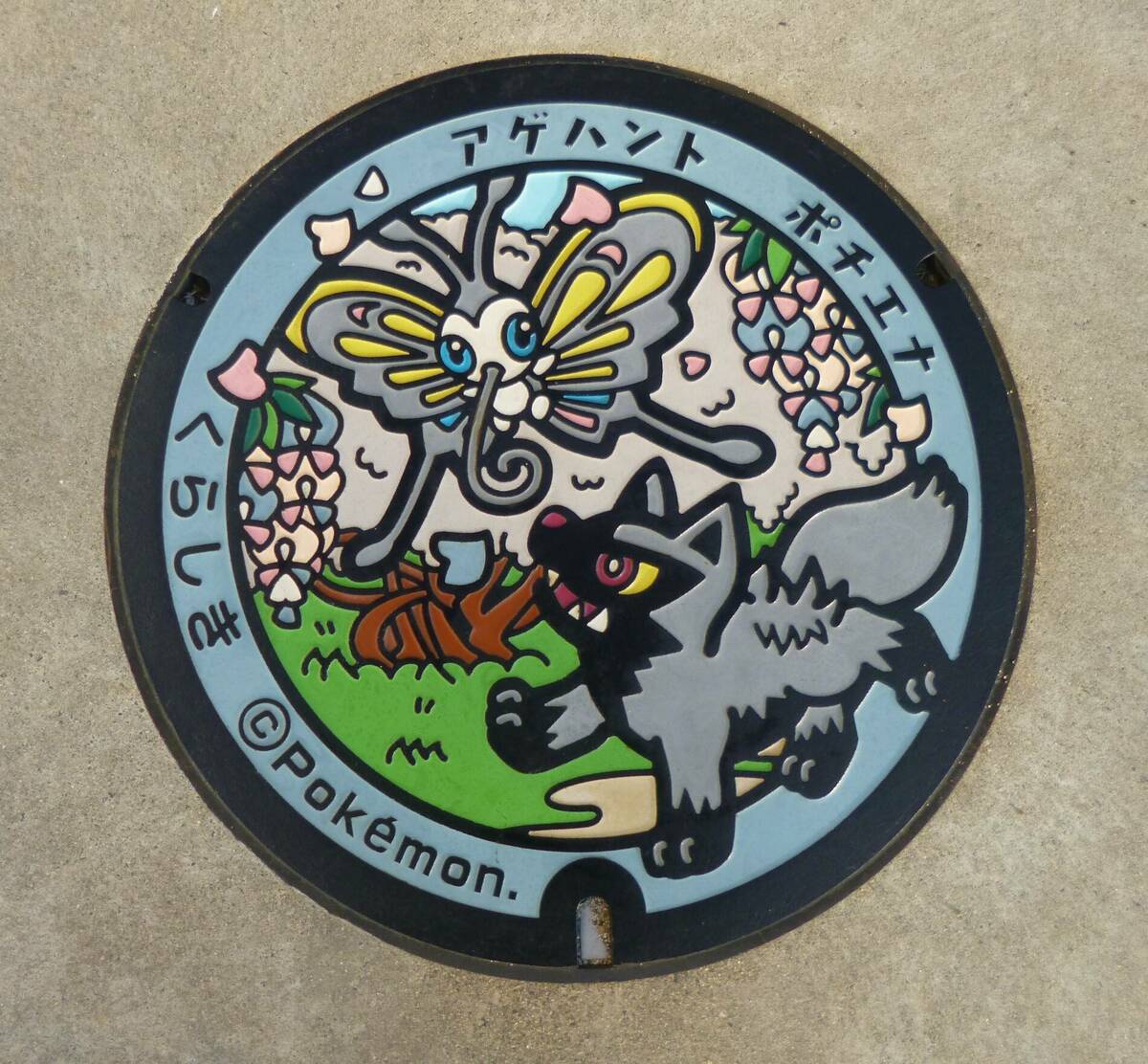 美観地区を見守る総鎮守「阿智神社」。 こちらの参道・西参道口付近には、「ケンホロウ(オスのすがた・メスのすがた)」が描かれたポケふたが設置されています。なまこ壁と藍色が際立つ和の風情たっぷりのデザインは、歴史ある街の雰囲気にぴったりです。