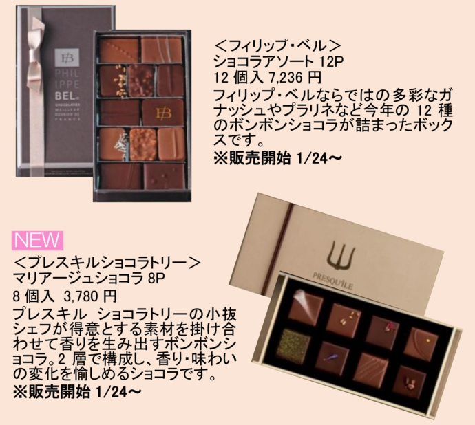 同じく、1月24日から、フランスの名ショコラティエ、フィリップ・ベルによる「ショコラアソート 12P」(12個入・7,236円)も登場。多彩なガナッシュやプラリネを詰め合わせた、贅沢なボンボンショコラです。