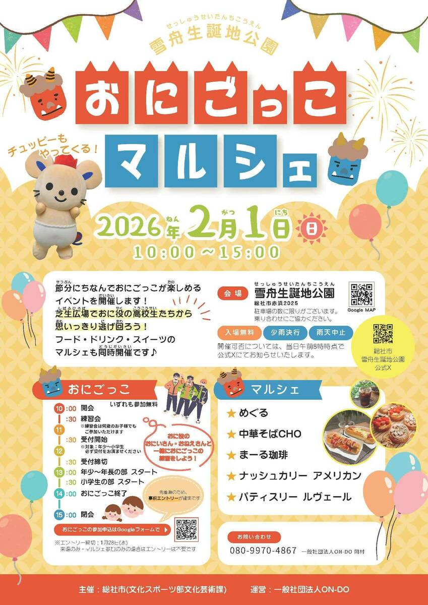 総社市の雪舟生誕地公園で、節分にちなんだ体験型イベント「おにごっこマルシェ」が、2026年2月1日(日)に開催されます。