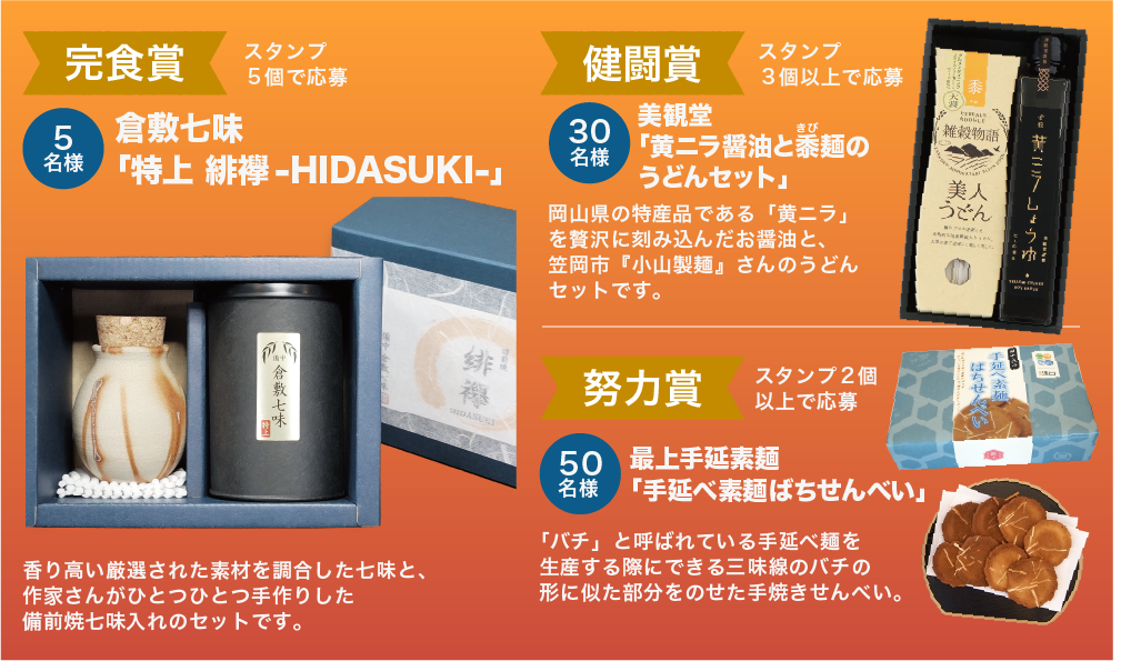 スタンプの数に応じて、豪華賞品が当たる抽選に応募可能。スタンプ2個で「手延べ素麺ばちせんべい」、3個で「黄ニラ醤油と秦麺のうどんセット」、5個集めると完食賞として、備前焼のボトルに入った「特上 緋襷(ひだすき)」などが用意されています。