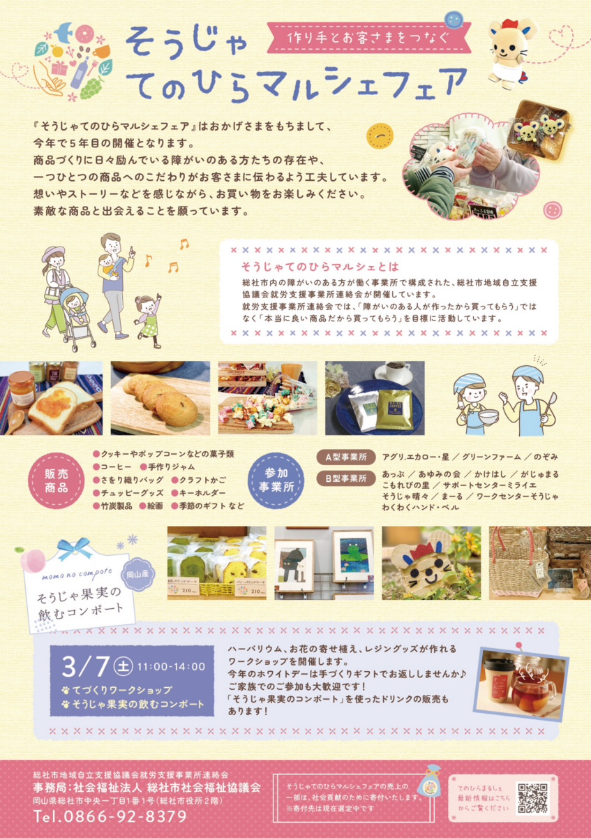 総社市内の障がい者就労支援事業所が手がける、こだわりの品々を集めた「そうじゃ てのひらマルシェフェア」が今年も開催されます 。このフェアは、支援のためではなく「本当に良いものだから買いたい」と思える商品作りを大切にしてきました 。