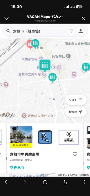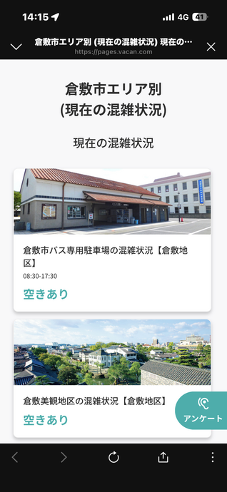 倉敷美観地区などの主要観光エリアの混雑状況や、倉敷市中央駐車場など、中心部の駐車場の混み具合が手元でチェック可能。密を避けて賢く観光を楽しめます。