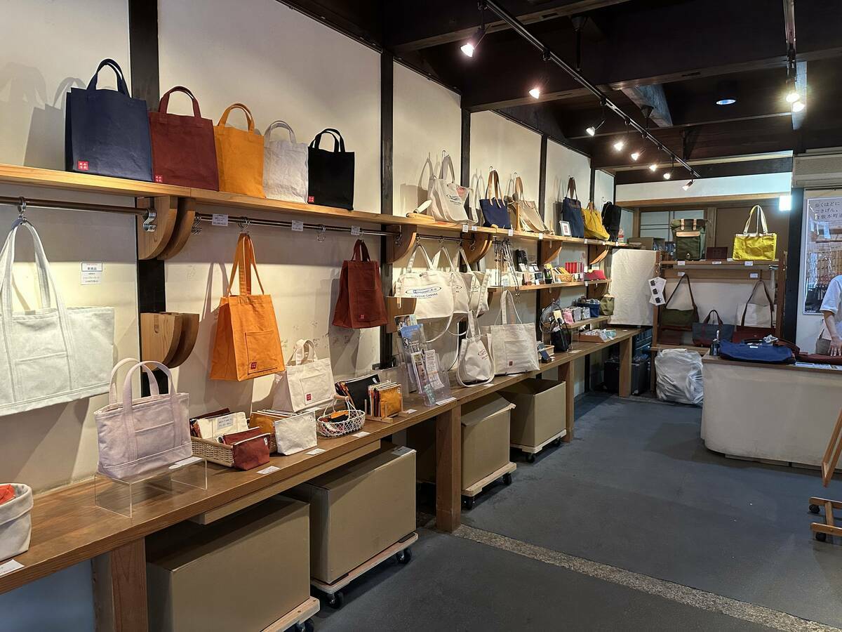 130年以上の歴史で培われた糸撚り(糸をねじり合わせる)技術によって生み出されたセルヴィッジ(耳)を持つ「倉敷帆布」。その生地は丈夫で使い込むほどに味わいが増します。直営店の「倉敷帆布 美観地区店」は2008年にオープン。古民家を再生した店舗に帆布の暖簾が目印で、店内にはさまざまなサイズのバッグや小物が並んでいます。
