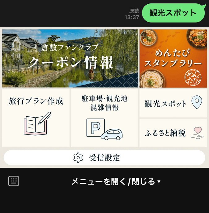 LINEで「倉敷ファンクラブ(ID: @kurashikicity)」を友だち登録するだけ。 年齢や居住地を登録しておけば、自分にぴったりの旬な観光・イベント情報が届きます。観光客だけでなく、地元・倉敷市民の皆様にとっても「今週末、どこ行く?」の答えが見つかる便利なツールです 。アプリ不要。LINEを登録するだけで、クーポン・混雑情報・観光マップが全部使えます。