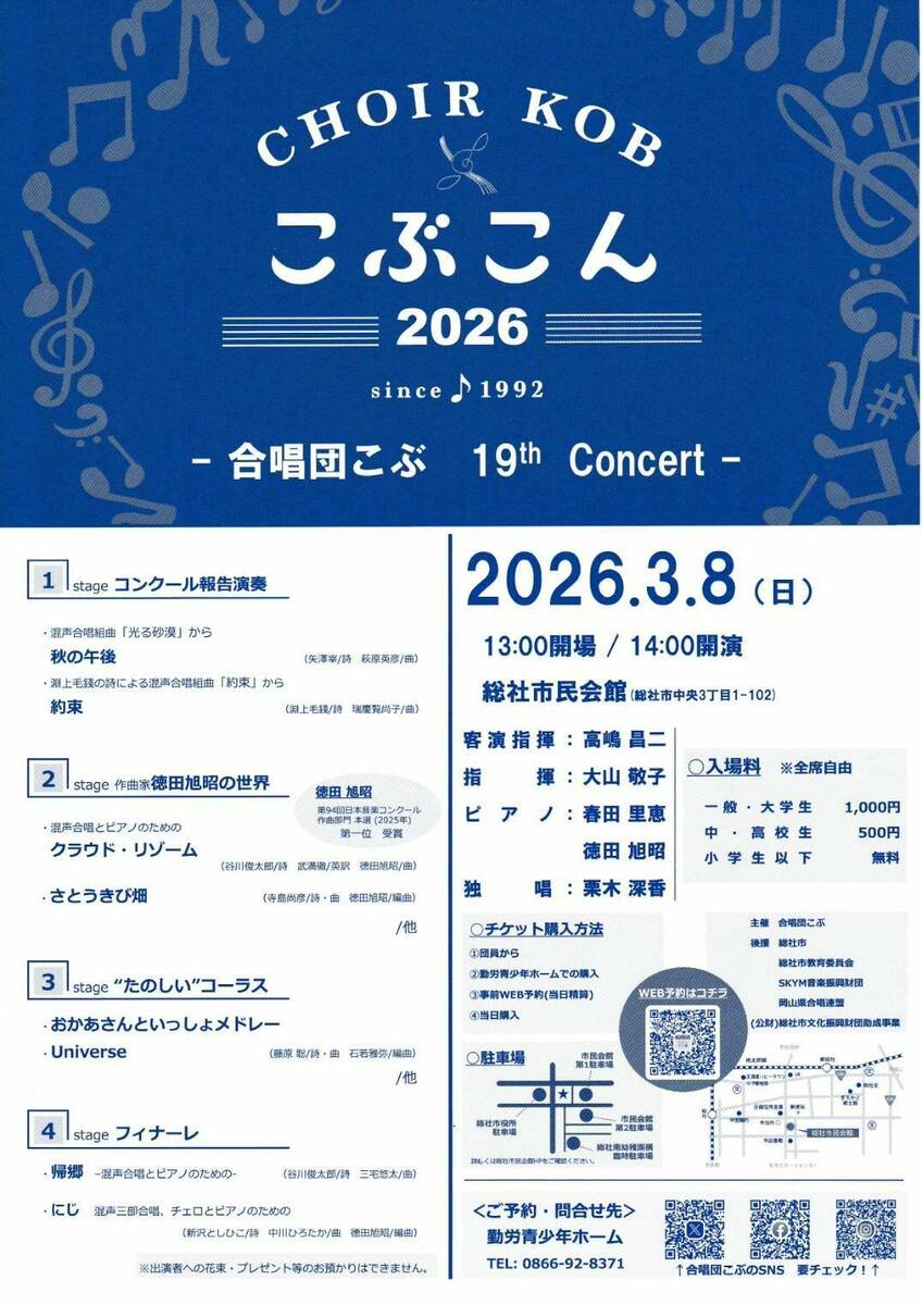 合唱団こぶのコンサート「こぶこん2026」は3月8日(日)総社市民会館で開催されます。