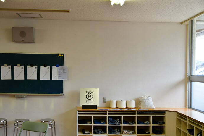 懐かしい玄関をくぐると、そこに広がるのは洗練されたデニムプロダクトの数々。そしてガラス越しには、ミシンの音が響く縫製工場。ここは、“元幼稚園”のデニム工場と直営ショップです。