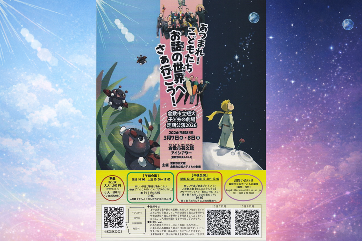倉敷市立短期大学の学生劇団「子どもの劇場」による恒例の定期公演が、2026年3月7日(土)・8日(日)の2日間、 倉敷市芸文館アイシアターで開催されます。