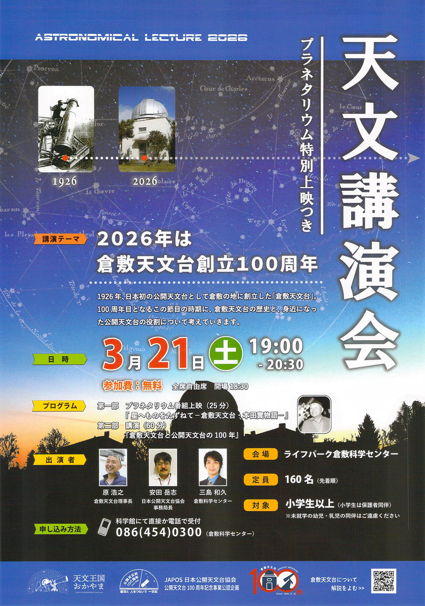 倉敷天文台創立100周年記念 天文講演会が3月21日開催