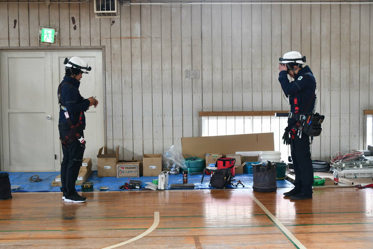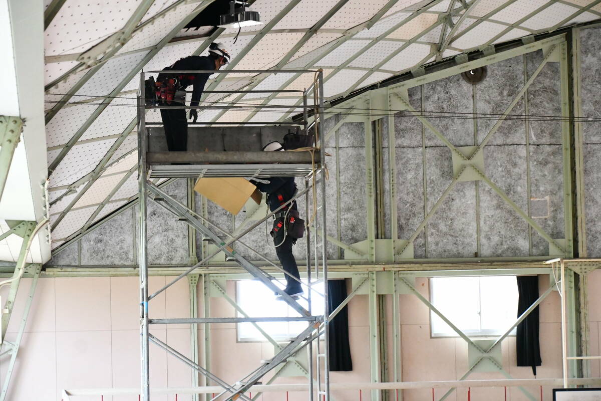 静まり返った体育館の天井に、ひときわ眩しい光が射し込む。その下では、足場に上った作業員たちが黙々と手を動かしていた。LE…