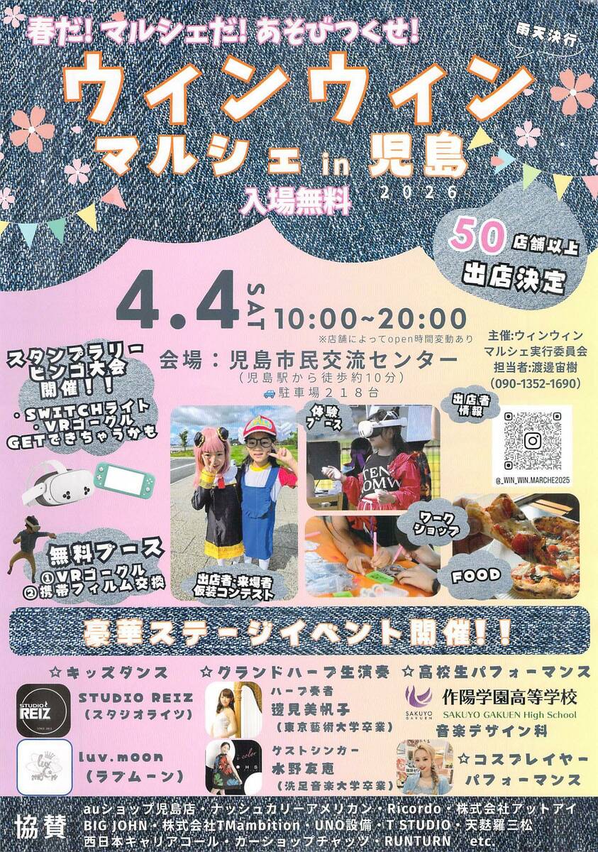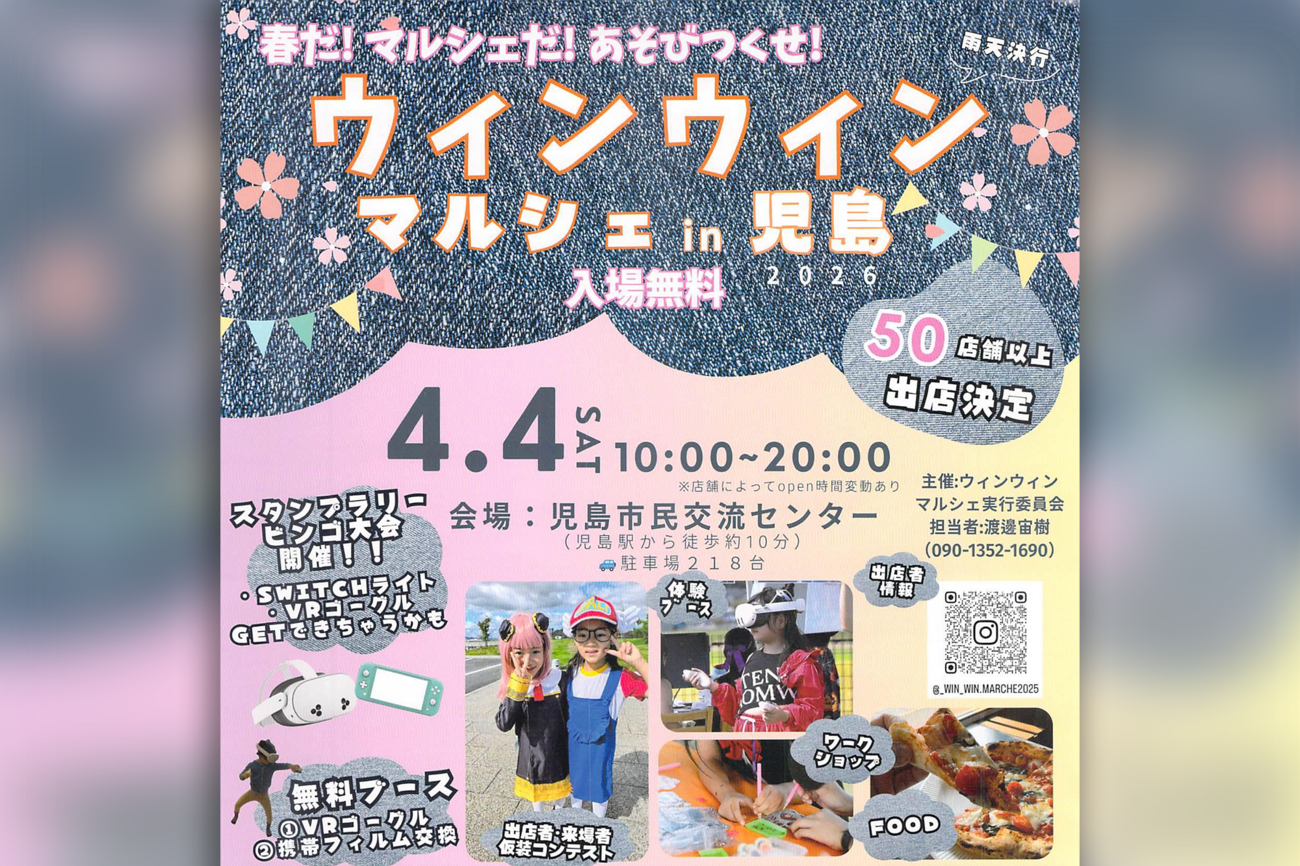 春のおでかけが楽しくなる季節、2026年4月4日(土)に「ウィンウィンマルシェ in 児島 2026」が児島市民交流センターで開催されます。50店舗以上が並ぶほか、ステージイベントやスタンプラリー、ビンゴ大会など、1日を通して楽しめる内容がそろいます。