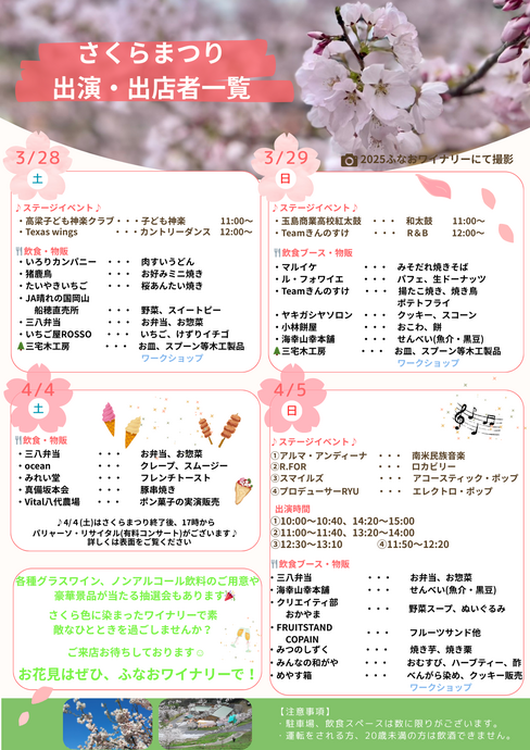 会場となるふなおワイナリーでは、3月28日・29日、4月4日・5日に「さくらまつり」を同時開催。昼間は桜や会場の催し、お食事を満喫し、夕暮れ時からは音楽に浸るという、贅沢な一日を過ごせます。