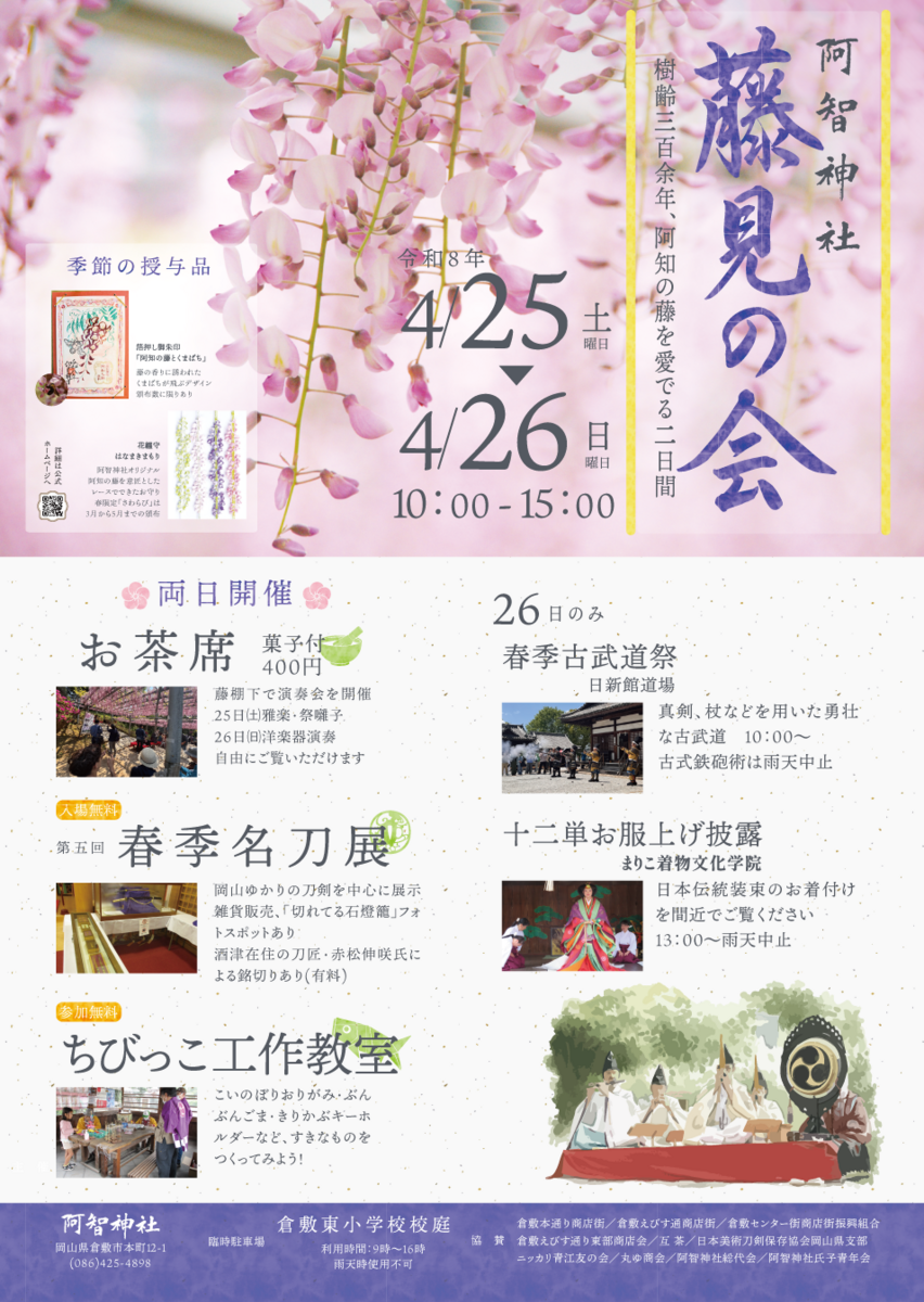 期間中は、お茶席や雅楽演奏、古式武道祭、日本刀の展示、十二単お服上げ披露、ちびっこ工作教室など、世代を問わず楽しめる催しが予定されています。いずれも春の境内を彩る阿知の藤とともに、阿智神社ならではの伝統文化に親しめる内容です。